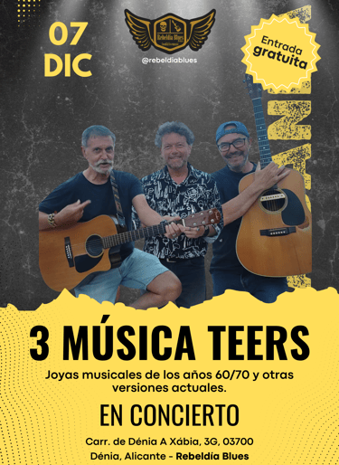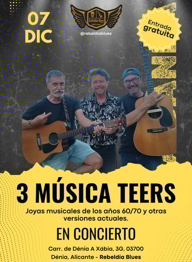 El sábado 7 de diciembre, Rebeldía Blues te invita a un viaje musical inolvidable con 3 Música Teers, un grupo que combina los clásicos de los años 60 y 70 con versiones contemporáneas.