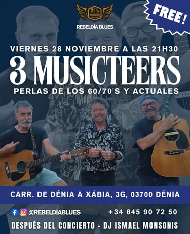 Este viernes 28 de noviembre llega a Rebeldía Blues un concierto lleno de clásicos y buena vibra con 3 Musicteers. Perlas musicales de los 60, 70 y de hoy, entrada gratuita y ambiente top para empezar el finde.