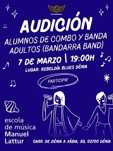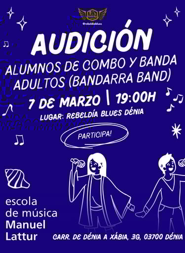 Disfruta de la Audición de Alumnos de Combo y Banda Adultos (Bandarra Band) de la Escuela de Música Manuel Lattur de Dénia el próximo 7 de marzo a las 19:00 h en Rebeldía Blues. ¡Una noche llena de talento y pasión musical! 🎷🎸✨