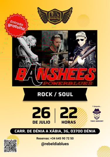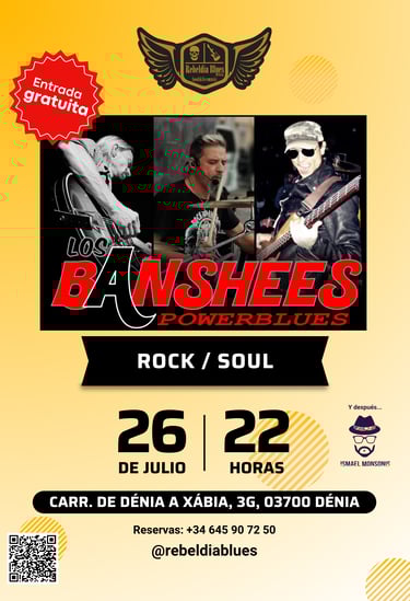 El próximo viernes 26 a las 22:00h, Rebeldía Blues se llenará de la energía y el talento de Los Banshees Powerblues. Esta increíble banda nos deleitará con una mezcla explosiva de Rock y Soul que promete hacer vibrar a todos los asistentes.
