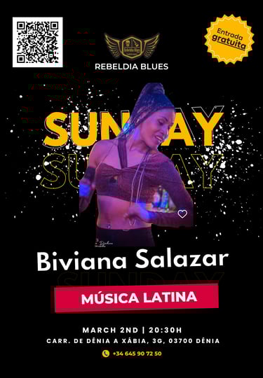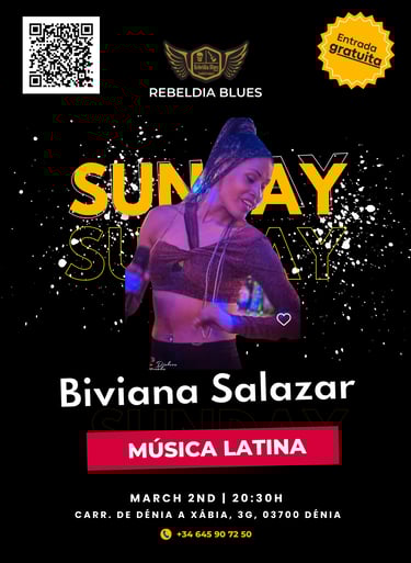 Este domingo 2 de marzo, déjate envolver por el ritmo y la pasión de la Música Latina con Biviana Salazar desde las 20:30. ¡Una noche llena de energía, emoción y buen ambiente en Dénia!