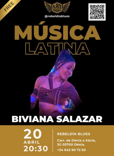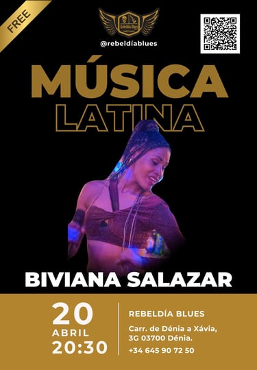 El domingo 20 de abril a las 20:30, ven a disfrutar de una noche vibrante con el ritmo y la pasión de Biviana Salazar, quien llenará de color y energía el escenario de Rebeldía Blues Dénia con su inconfundible estilo de música latina.