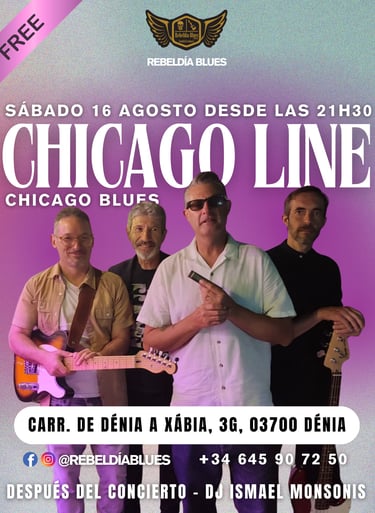 Vive una noche de auténtico Chicago Blues con Chicago Line el sábado 16 de agosto en Rebeldía Blues Dénia. ¡Entrada gratuita y DJ para cerrar la noche!