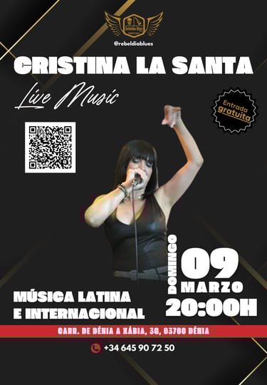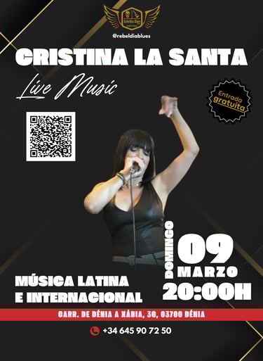 ¡No te pierdas a Cristina la Santa este domingo 9 de marzo a las 20:00 h en Rebeldía Blues Dénia! Disfruta de una noche única con la mejor música latina e internacional en un ambiente vibrante y lleno de ritmo. 🎶💃