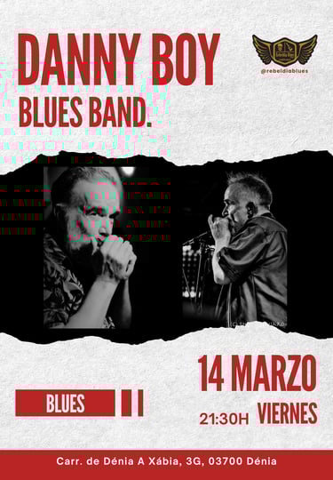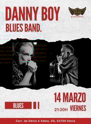 El próximo viernes 14 de marzo, a partir de las 21:30 h, el escenario de Rebeldía Blues Dénia vibrará con la increíble energía de DANNY BOY BLUES BAND. Déjate envolver por el mejor blues en directo en un espectáculo lleno de pasión y buen ritmo.