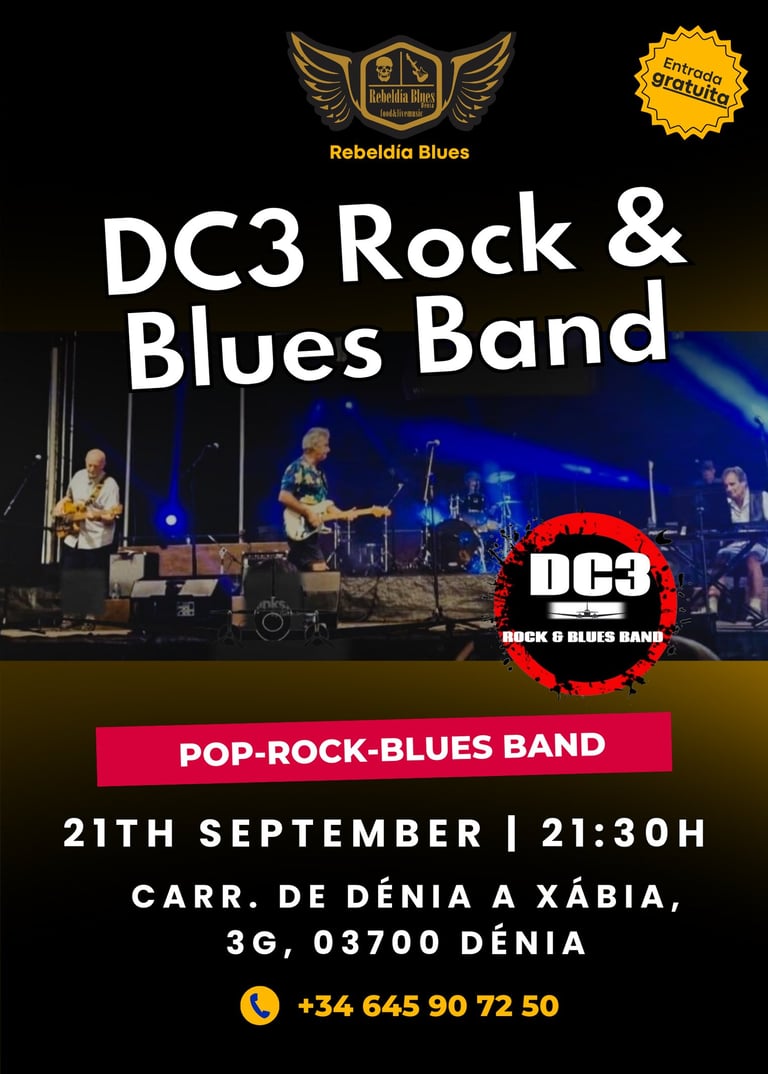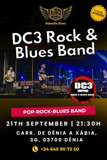 Este 21 de septiembre a las 21:30, en Rebeldia Blues, tenemos el honor de presentar a la increíble DC3 Rock & Blues Band. Si eres amante del rock, el blues o simplemente buscas disfrutar de buena música en un ambiente único, ¡no te lo puedes perder!