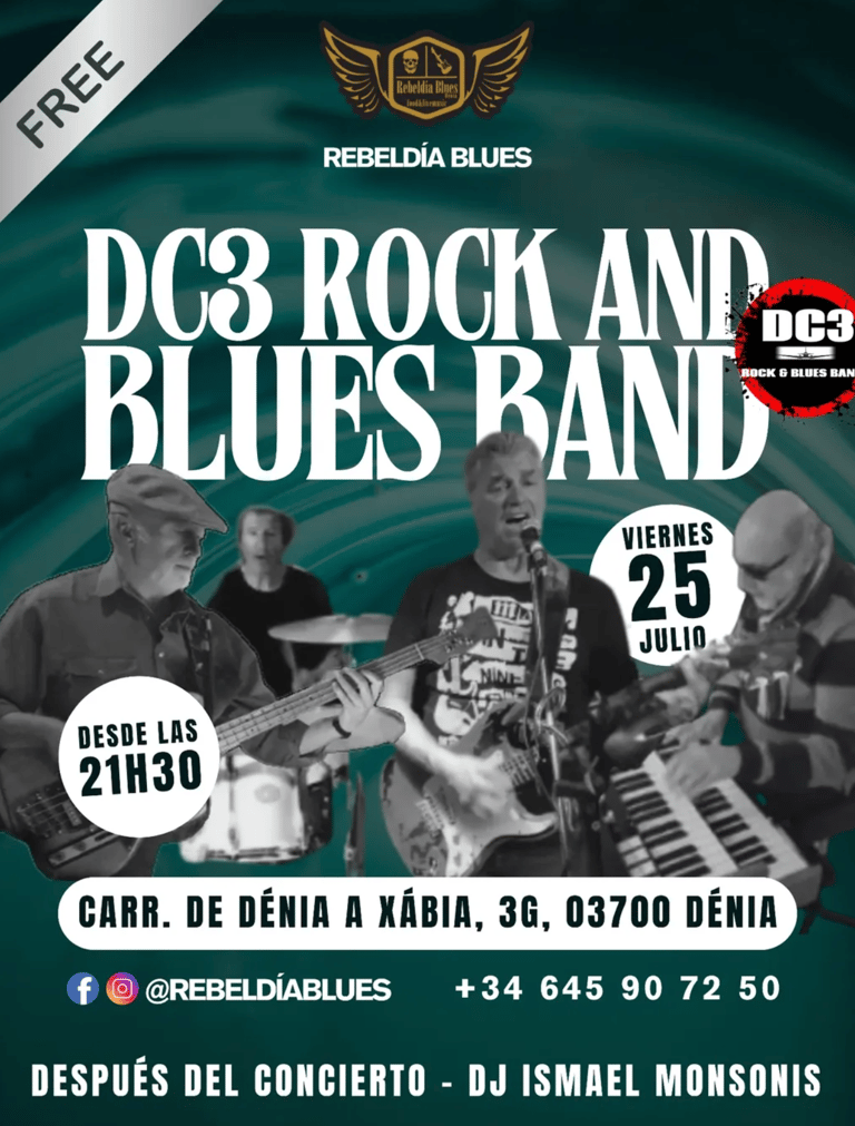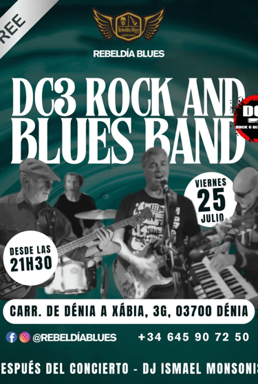Este 25 de julio a las 21:30, en Rebeldia Blues, tenemos el honor de presentar a la increíble DC3 Rock & Blues Band. Si eres amante del rock, el blues o simplemente buscas disfrutar de buena música en un ambiente único, ¡no te lo puedes perder!