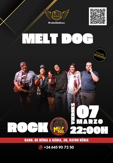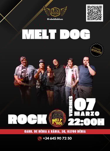 ¡No te pierdas el concierto de Melt Dog este viernes 7 de marzo a las 22:00 h en Rebeldía Blues Dénia! Una noche cargada de energía, guitarras afiladas y puro rock en vivo. Ven con tus amigos y disfruta de la mejor música en directo. 🎸🔥