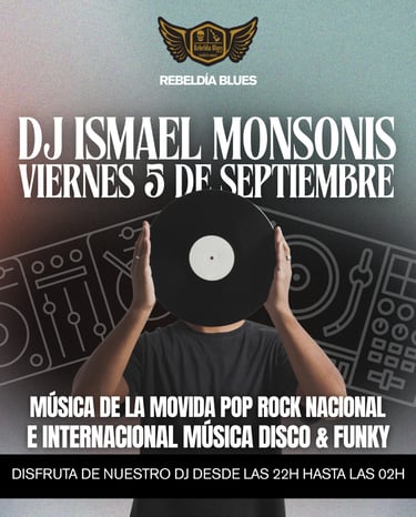 El viernes 5 de septiembre prepárate para una noche única en Rebeldía Blues de la mano de nuestro DJ residente, Ismael Monsonis. Su selección musical combina lo mejor de la movida pop rock nacional con ritmos internacionales de disco y funky, creando una atmósfera perfecta para bailar y disfrutar hasta altas horas.
