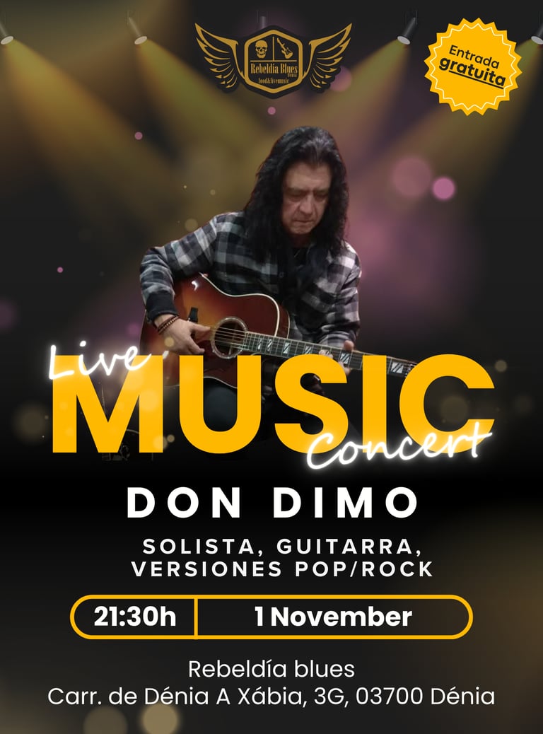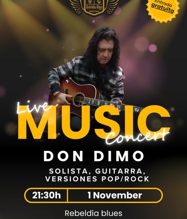 No te pierdas a Don Dimo en concierto en Rebeldía Blues, Dénia. Disfruta de una noche de pop y rock en vivo el 1 de noviembre a las 21:30h. ¡Entrada gratuita! | Rebeldia blues Denia | Musica en vivo