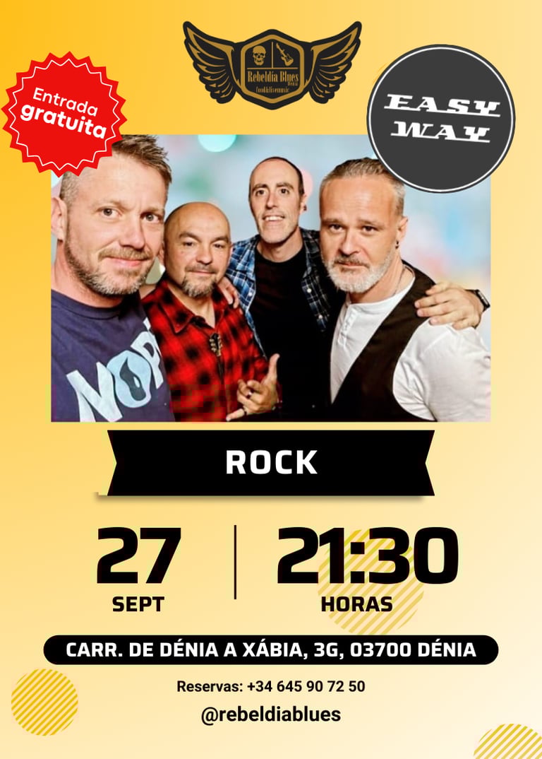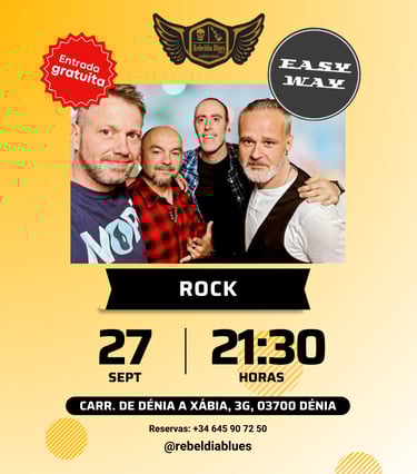 Este viernes 27 de septiembre, la banda de rock Easy Way se presentará en Rebeldía Blues para ofrecerte una noche llena de la mejor música en vivo. 🎸