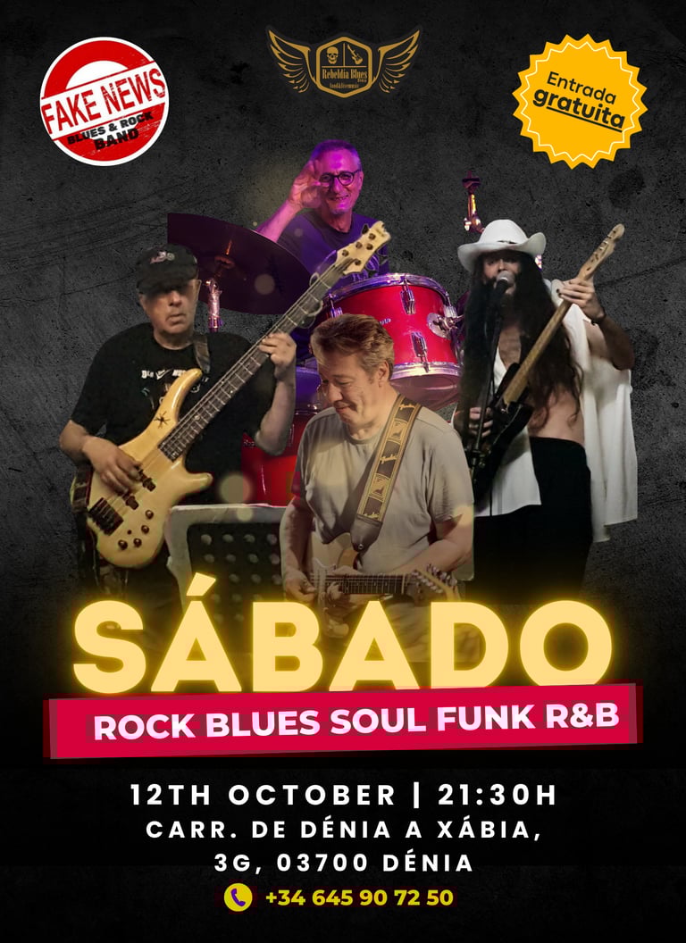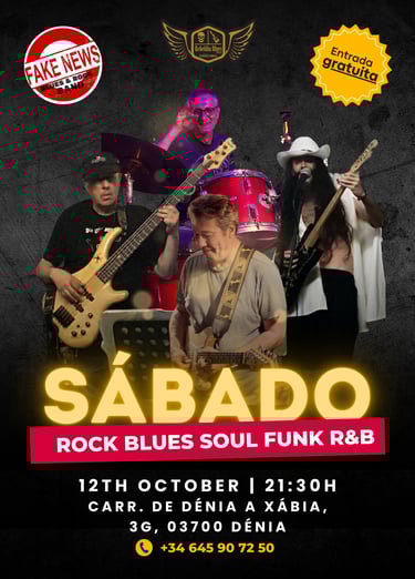 Este sábado 12 de octubre, Rebeldía Blues trae un espectáculo en vivo que te hará viajar por los géneros más icónicos de la música con Fake News Blues & Rock Band. Desde el rock y el blues, hasta el soul, el funk y el R&B, esta banda tiene todo lo que necesitas para una noche épica.