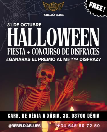Celebra Halloween 2025 en Rebeldía Blues Dénia con nuestra fiesta especial y concurso de disfraces. Entrada gratis, premios y ambiente único.