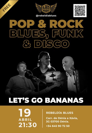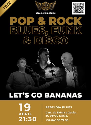 Este sábado 19 de abril a las 21:30, prepárate para una noche cargada de ritmo, color y mucha diversión con la llegada de Let's Go Bananas al escenario de Rebeldía Blues Dénia.