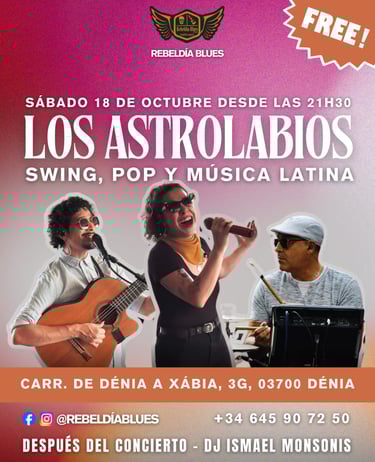 El sábado 18 de octubre, Los Astrolabios llegan a Rebeldía Blues con un espectáculo de swing, pop y música latina para disfrutar y bailar en Dénia. Entrada gratuita desde las 21:30h.