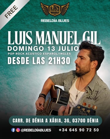 Cerramos el fin de semana con una noche especial: el domingo 13 de julio a las 21:30 h nos visita Luis Manuel Gil, con su estilo de pop rock acústico en español e inglés.