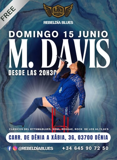 El domingo 15 de junio, a partir de las 20:30h, Rebeldía Blues se viste de gala para recibir a M. Davis. Será una noche inolvidable para los amantes de la buena música en directo, donde sonarán los mejores clásicos del rhythm & blues, soul, reggae y rock de los años 60, 70 y 80.