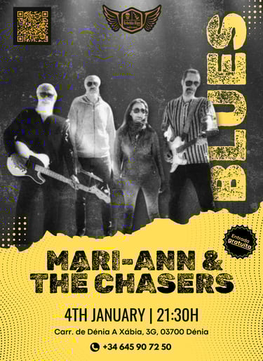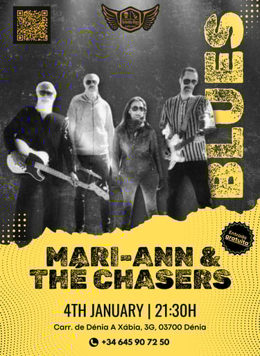 El sábado 4 de enero, no te pierdas una noche llena de ritmo y emoción. Mari-Ann & Thé Chasers, un combo excepcional de Texas Blues, llega a Rebeldía Blues para ofrecer un espectáculo inolvidable.