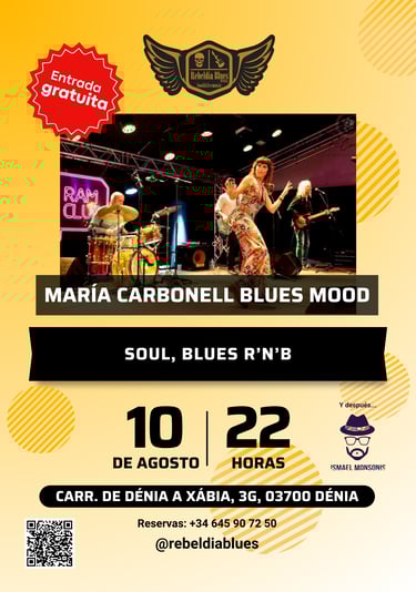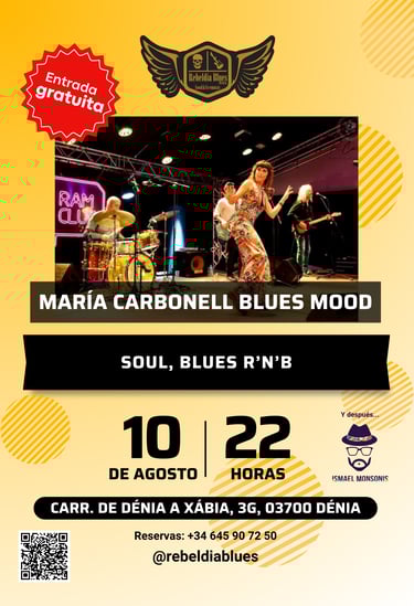 ¡Amantes de la música en vivo, prepárense para una noche llena de magia y ritmos en Rebeldía Blues! Presentamos en vivo a Maria Carbonell BLUES MOOD, que promete una experiencia musical inolvidable el 10 de agosto a las 22:00h.