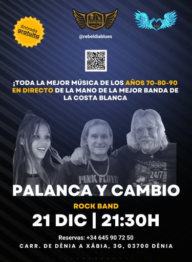 El sábado 21 de diciembre, vive una noche espectacular con la mejor música en vivo. Rebeldía Blues te invita a disfrutar de un evento único junto a Palanca y Cambio, una increíble banda anglo-uruguaya-italiana, reconocida como una de las mejores de la Costa Blanca.