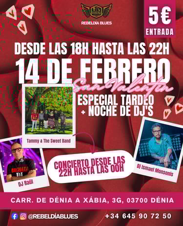 Este viernes 14 de febrero celebramos el amor en Rebeldía Blues con un especial Tardeo + Concierto en directo + Noche de DJs. Una cita perfecta para bailar, disfrutar y vivir San Valentín con música y muy buen ambiente.