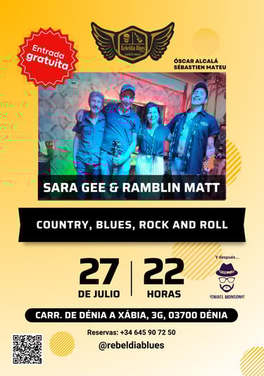 Este sábado 27 a las 22:00h, te invitamos a una velada musical única en Rebeldía Blues con la presentación especial de Sara Gee & Ramblin Matt. Prepárate para una noche llena de Country, Blues y Rock and Roll que no querrás perderte.