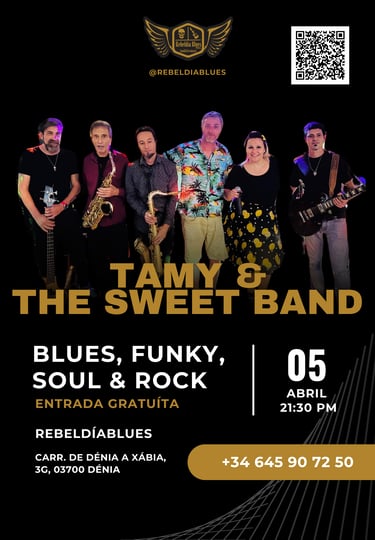 El próximo viernes 5 de abril, a partir de las 21:30, prepárate para una noche cargada de emociones, buena música y una energía imparable en Rebeldía Blues Dénia. Llega al escenario Tamy & The Sweet Band, una formación que desborda talento y pasión en cada nota.