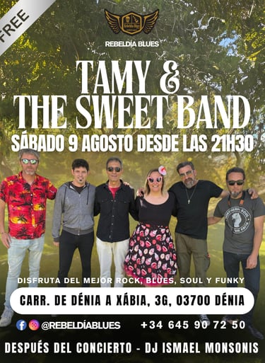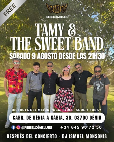 Vive una noche de rock, soul y funky con Tamy & The Sweet Band el sábado 9 de agosto en Rebeldía Blues Dénia. Entrada gratuita y DJ para cerrar la noche.