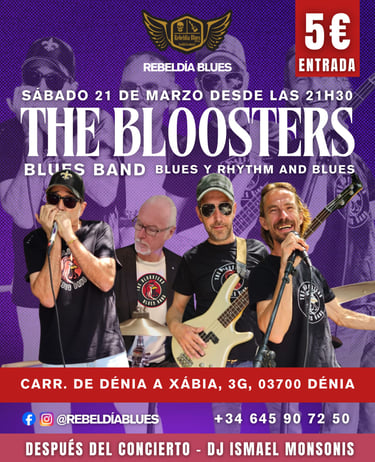 Este sábado 21 de marzo llega a Rebeldía Blues THE BLOOSTERS blues band, con un potente directo que combina blues y rhythm & blues en un concierto lleno de groove, buen rollo y el auténtico sonido del blues sobre el escenario.