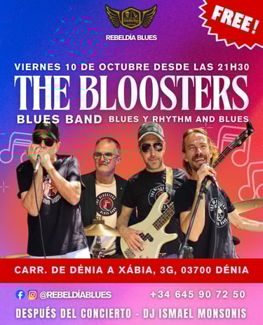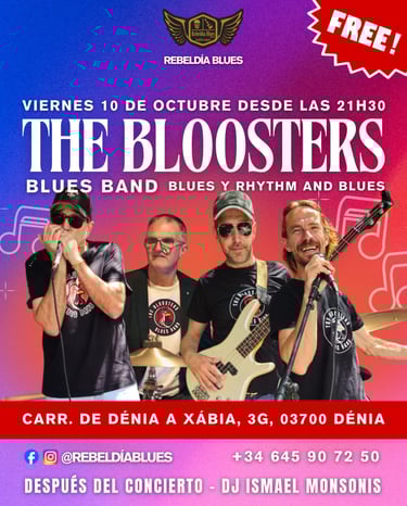 El viernes 10 de octubre, Rebeldía Blues recibe a The Bloosters, una banda que combina blues y rhythm and blues en un directo lleno de energía. Entrada gratuita en Dénia.