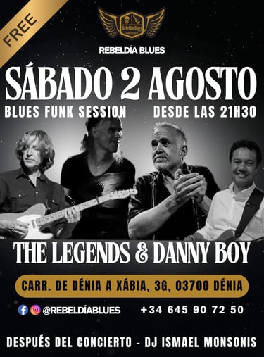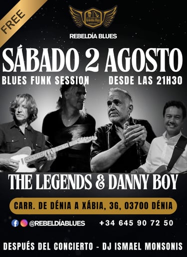Este sábado 2 de agosto, no te pierdas una noche espectacular en Rebeldía Blues (Dénia) con la actuación en directo de The Legends & Danny Boy. Desde las 21:30 h, el escenario se llenará de energía con una potente sesión de blues y funka cargo de músicos de gran trayectoria.