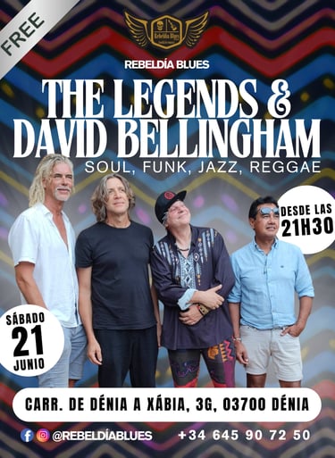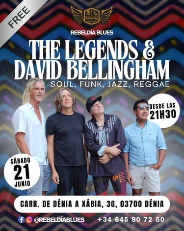 Este sábado 21 de junio, a partir de las 21:30 h, el escenario de Rebeldía Blues Dénia se llena de ritmo, groove y emoción con la actuación en vivo de The Legends & David Bellingham.