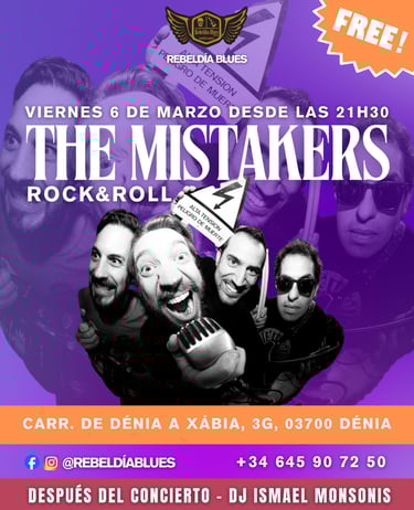 Este viernes 6 de marzo llega a Rebeldía Blues la fuerza de THE MISTAKERS, una banda que trae una auténtica descarga de rock & roll con energía, actitud y temazos que no te dejarán parar quieto.