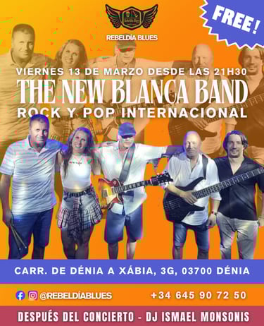 El viernes 13 de marzo Rebeldía Blues recibe a THE NEW BLANCA BAND con una noche llena de rock y pop internacional, grandes clásicos y un directo cargado de energía para disfrutar de la música en vivo.