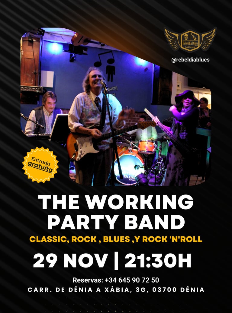 Este viernes 29 de noviembre, te invitamos a una noche llena de clásicos inolvidables con The Working Party Band. Prepárate para disfrutar de lo mejor del Classic Rock, Blues y Rock 'n' Roll en el ambiente único de Rebeldía Blues, tu bar de música en vivo favorito en Dénia.