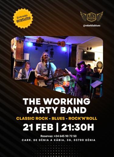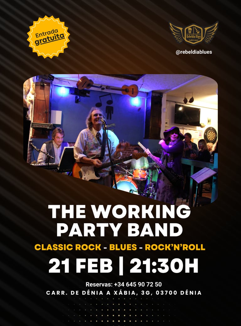 Este viernes 21 de febrero, te invitamos a una noche llena de clásicos inolvidables con The Working Party Band. Prepárate para disfrutar de lo mejor del Classic Rock, Blues y Rock 'n' Roll en el ambiente único de Rebeldía Blues, tu bar de música en vivo favorito en Dénia.