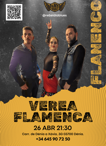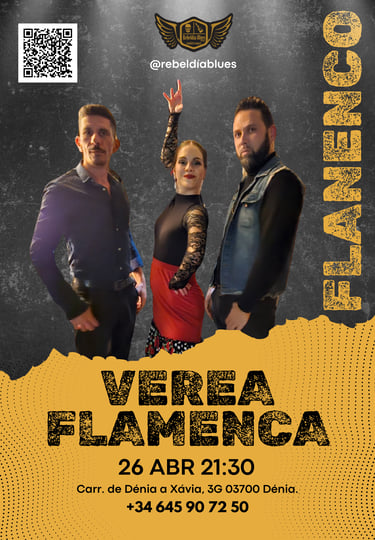 El sábado 26 de abril a las 21:30, el alma del sur se apodera del escenario de Rebeldía Blues Dénia con la llegada de Verea Flamenca, un grupo que nos hará vibrar al compás del flamenco, las sevillanas y las bulerías.